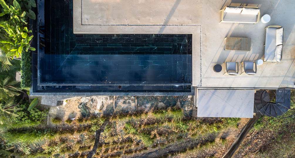 The villas' geometric forms, high ceilings, and columns draw inspiration from traditional Balinese architecture, merging indoor and outdoor spaces. Expansive glass walls offer sea views, while large doors lead to shaded decks, sun-drenched balconies, and terraces. Interior landscaping enhances the connection to the jungle's organic shapes. Each villa has a private entrance, saltwater infinity pool, and spacious outdoor living areas surrounded by lush rainforest, maintaining a minimal ecological footprint.